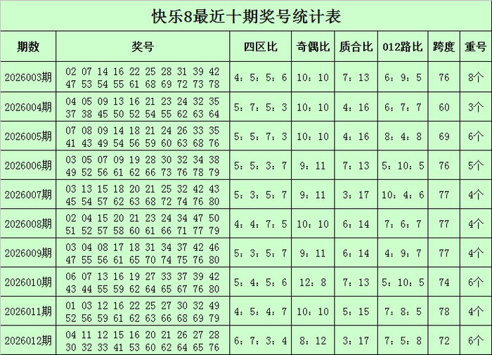 福彩快乐8第2026012期开奖回顾:04 11 12 15 16 20 21 26 27 28 30 32 33 41 53 60 62 64 65 76,其中奖号四区比为6:7:3:4,奇偶比为8:12,质合比为3:17,跨度为72,012路比为7:5:8,开出6个重号:12、16、27、30、32、62。