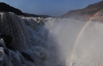 3月3日,黄河水从黄河壶口瀑布倾泻而下,水雾中,一道绚丽的彩虹清晰可见。(吕桂明 摄)